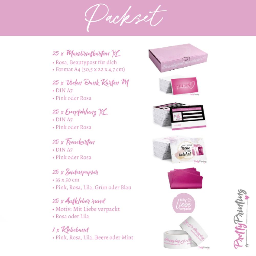 Wir schaffen Verbindung zwischen Verpacken und Kundenservice! Mit dem Packset hast du alles was du brauchst um deine Ware hübsch zu verpacken, deinen Kunden beim Auspacken ein Lächeln ins Gesicht zu zaubern und auch noch weitere Verkäufe in einem zu generieren. Wie klug ist das?