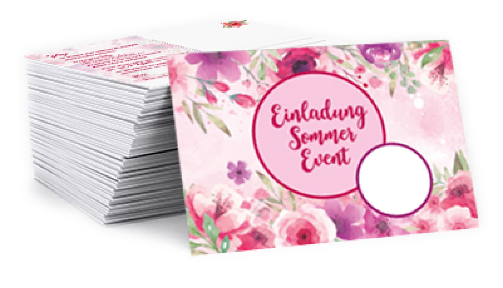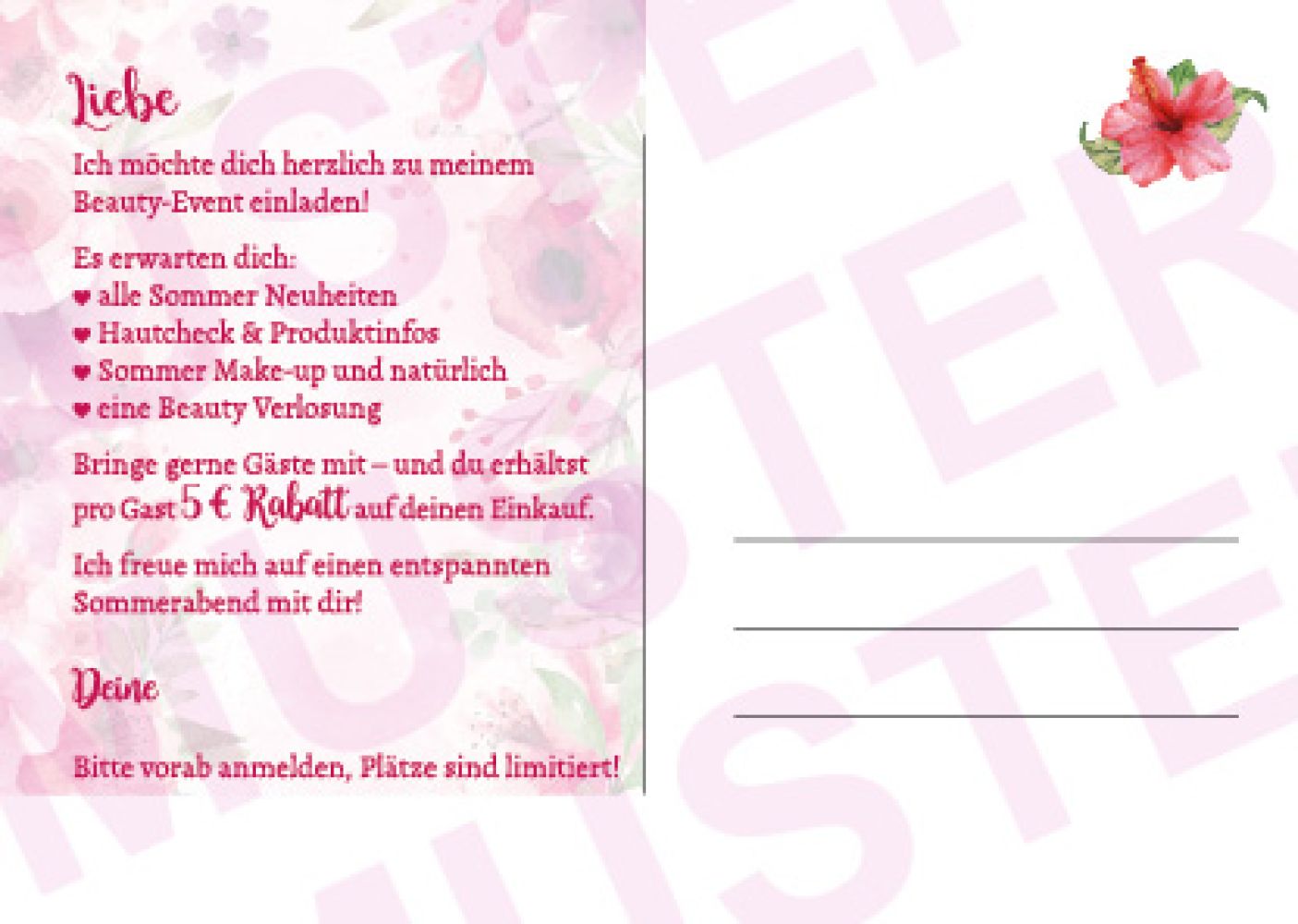 Sommer, Sonne, Kundenservice! Der Sommer bietet die perfekte Gelegenheit für Kundenservice  bei einem luftigen Sommer-Event - zeige ein frisches Sommer-Make-up, die Neuheiten, mache eine Beauty-Verlosung und neue Gäste bekommen auch noch Rabatt dazu. Wer bekommt da nicht Lust auf eine Beauty-Auszeit unter freiem Himmel? Mit unseren Sommer-Event-Karten im DIN A6-Format kannst du ganz einfach einladen.