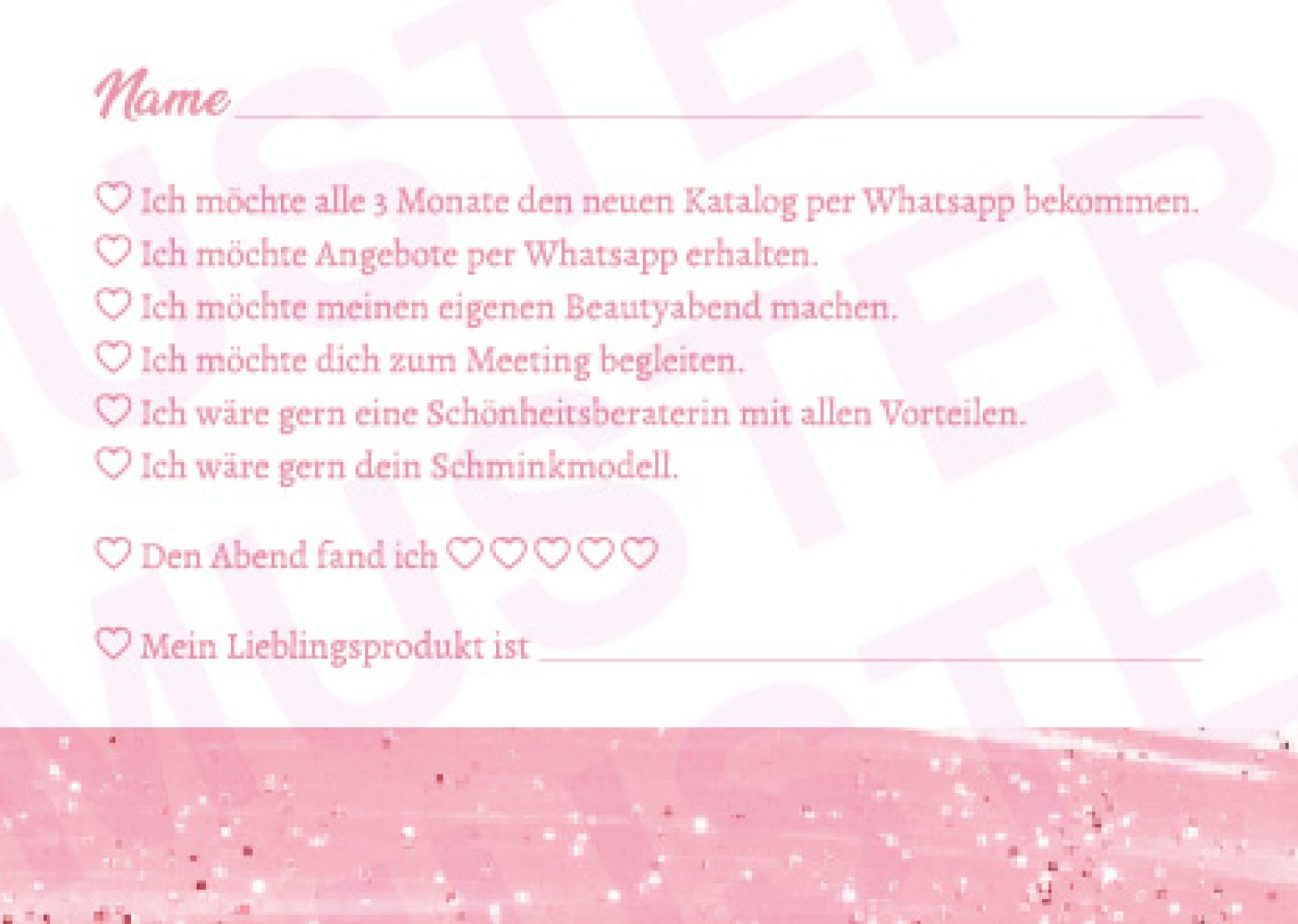 Kundenservice leicht gemacht. Lege auf Partys diese Karte in DIN A6 (in rosa oder schwarz) einfach an jeden Platz und lasse sie von allen Gästen am Ende ausfüllen. Schon hast du schriftlich einen Einblick welchen Service die Kunden wünschen und welches ihr Lieblingsprodukt ist. Die perfekte Info für Kundenservice, Chancen, neue Buchungen und Gastgeberinnen-Geschenke – und das alles auf einer Karte!